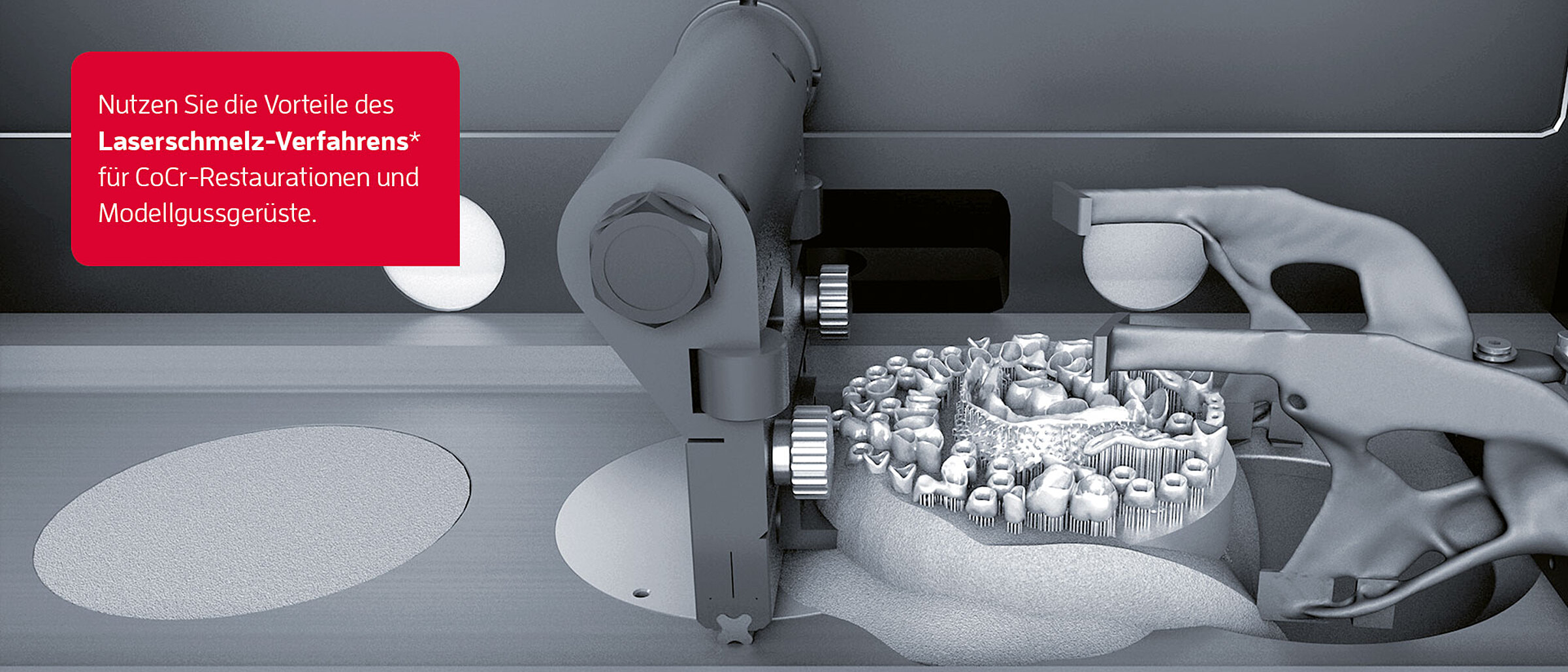 Nutzen Sie die Vorteile des Laserschmelz-Verfahrens für NEM-Restaurationen und Modellgussgerüste. Optimieren Sie Ihren Kostenaufwand. Profitieren Sie von hoher Effizienz und einem smarten Workflow.