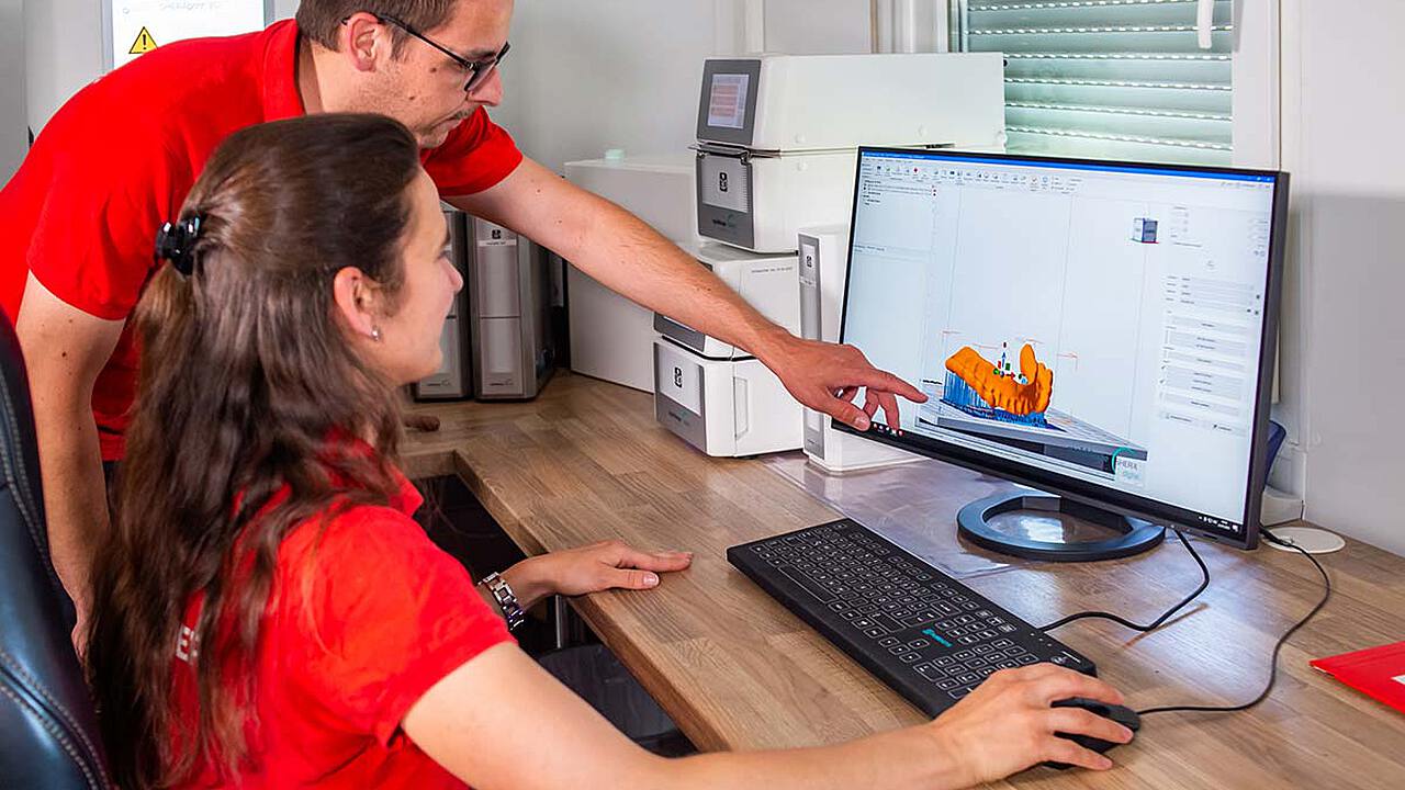 Bei unserer Arbeit vereinen wir Handwerk mit digitalen Technologien. Basis für den Zahnersatz ist die CAD/CAM-Fertigung. Bei der Veredlung kommt zahntechnische Kunstfertigkeit zum Einsatz. Wir verarbeiten eine Vielzahl an Materialien, z. B. Zirkonoxid, Hochleistungspolymere (z. B. PEEK), Lithium-Disilikat, NEM oder Titan. Ob auf Implantaten, Pfeilerzähnen oder im zahnlosen Kiefer – jeden Zahnersatz erstellen patientenorientiert.